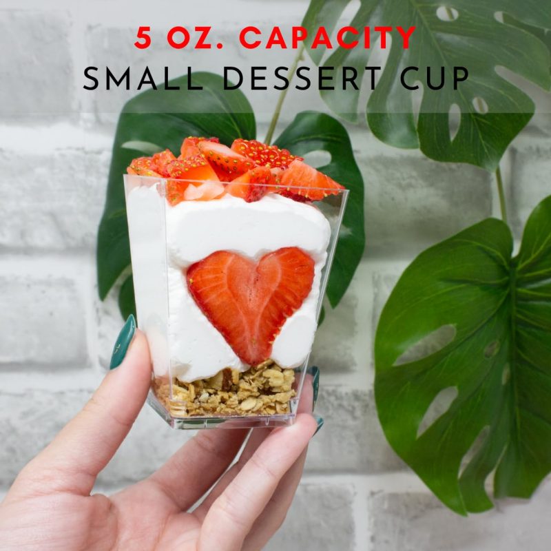 Small Dessert Cups: Perfect for stylish dessert presentation, these 5 oz small dessert cups are ideal for any event. Serve up your dessert creations in these sleek plastic containers.