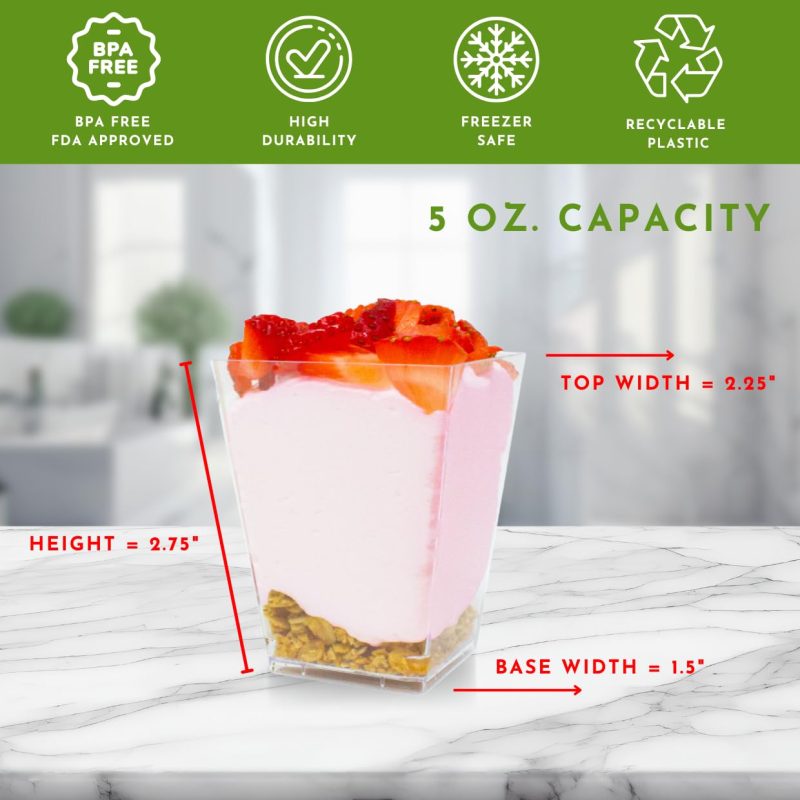 Sturdy Plastic Clear Cups: These plastic clear cups hold up to 5 oz of deliciousness. Great for parties, these mini appetizer cups help showcase desserts, appetizers, or snacks in style. Crafted from durable plastic, these 5 oz cups are perfect for parties, catering, and buffets. Enjoy the convenience of disposable cups!