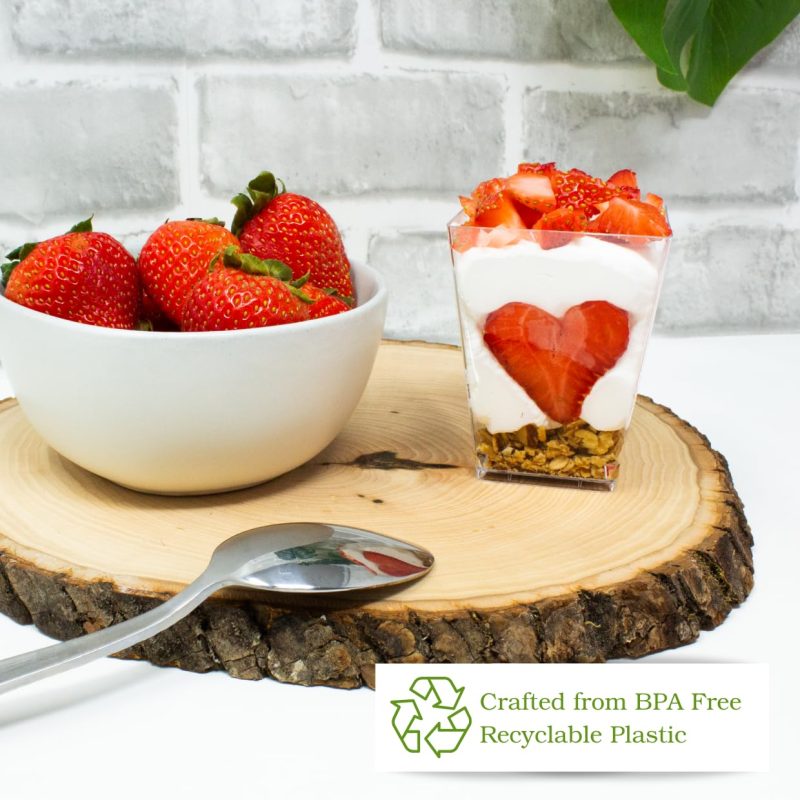 Versatile Plastic Containers: These dessert containers are great for showing off your sweet treats. Made from clear plastic, they make your desserts look irresistible at any gathering. These disposable cups are great for anything from fruit cocktails to savory appetizers.