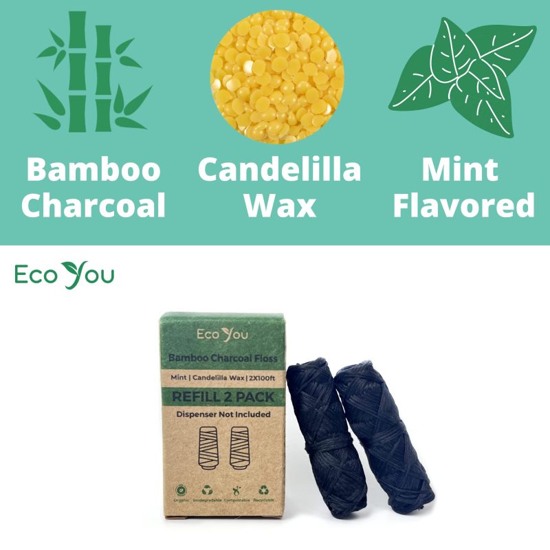 Floss Refill – Waxed with plant-based candelilla wax, flavored with natural organic mint. This charcoal floss is plastic free floss and has a refreshing peppermint flavor to provide a burst of freshness to your mouth when flossing.