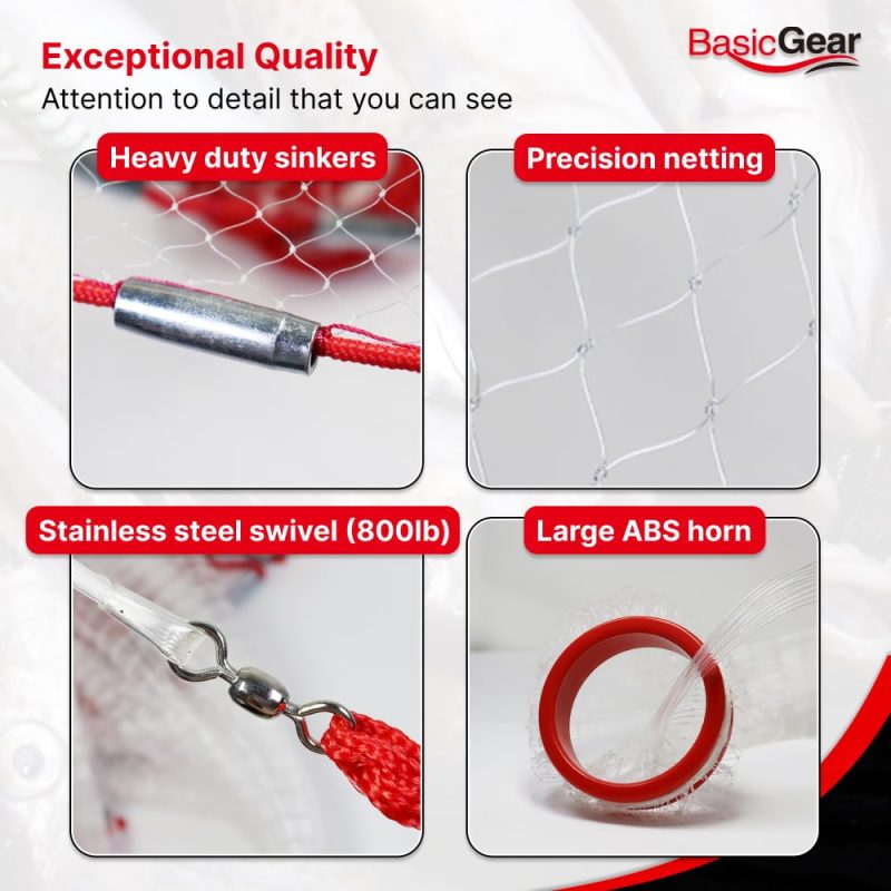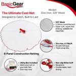 Cast Net | 3ft-12ft Radius, 3/8 or 1/4 inch Mesh for Freshwater and Saltwater Bait Fish| Professional Grade and Upgraded Material | Throw Style BasicGearTackle