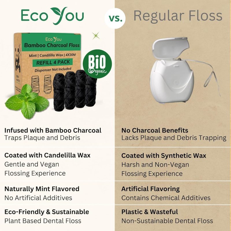 NON TOXIC DENTAL FLOSS – Waxed with plant-based candelilla wax, flavored with natural organic mint. Additionally, it is also pfas free dental floss, fluoride free, ptfe free , bpa free and vegan dental floss, This bamboo charcoal floss refill is plastic free floss and has a refreshing peppermint flavor to provide a burst of freshness to your mouth when flossing.