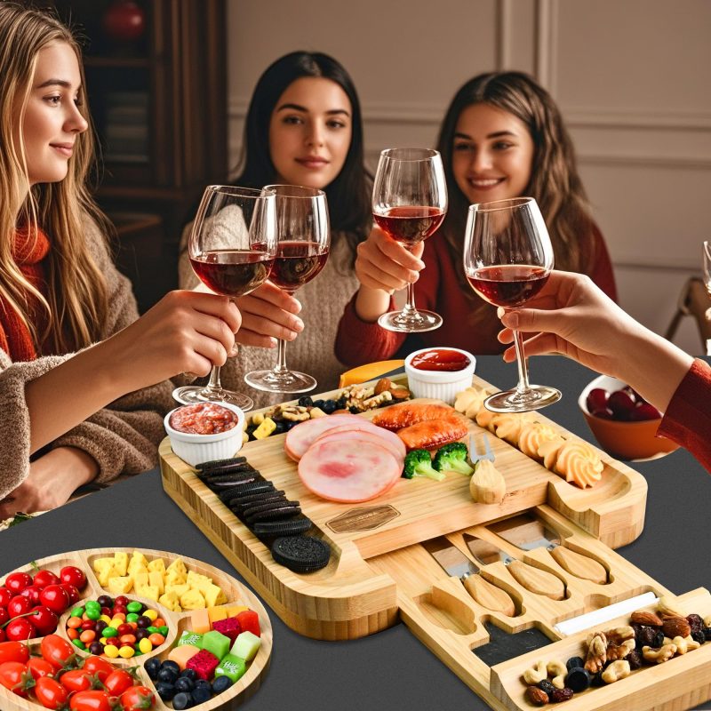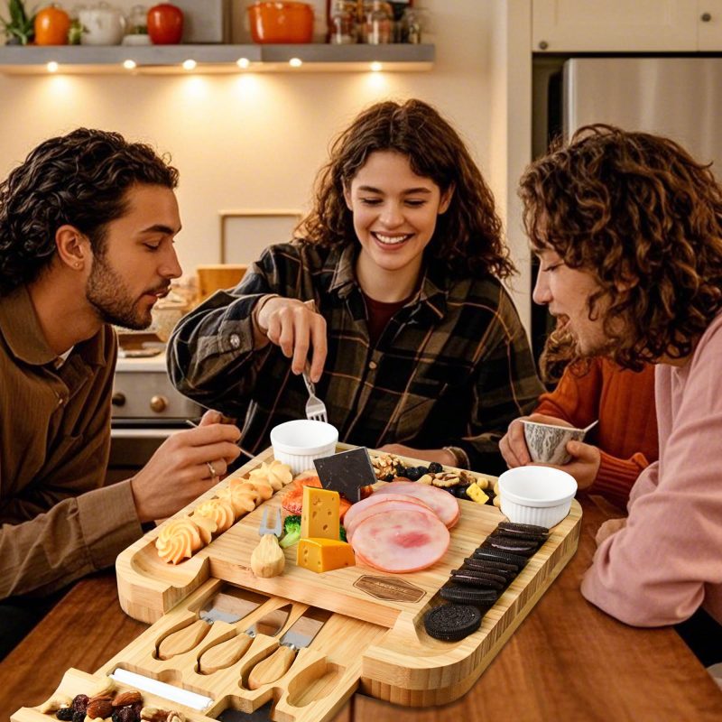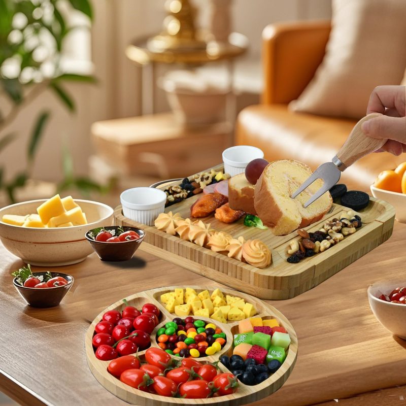 WHAT’S INCLUDED: The charcuterie boards accessories include 4 cheese board knives, 2 labeling tools, and a display block. The complimentary round wooden cheese tray and a cheese board guidebook is also included so you can decorate the bamboo charcuterie board with lid beautifully every time.