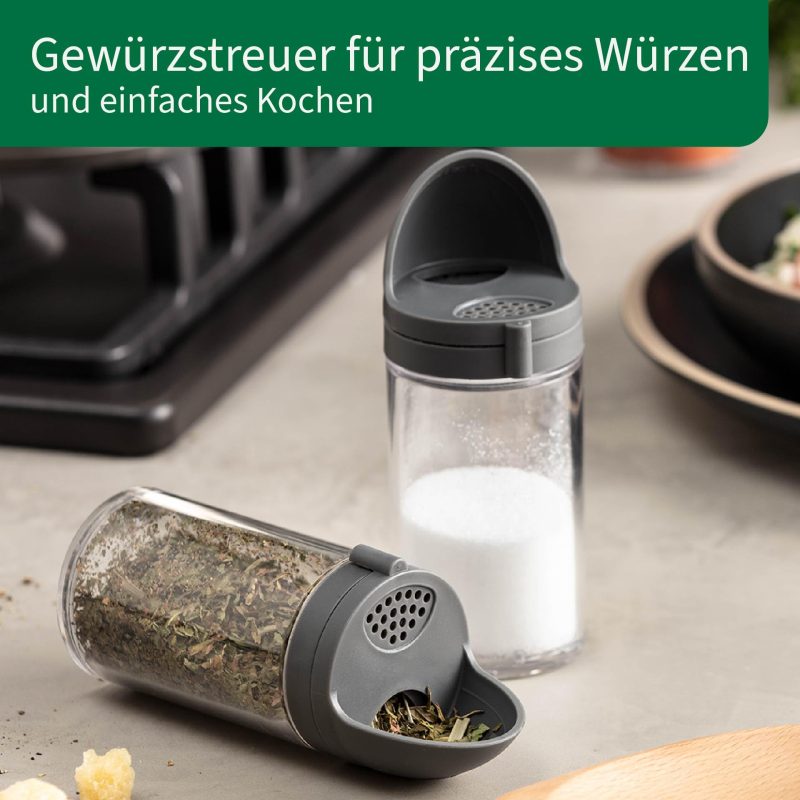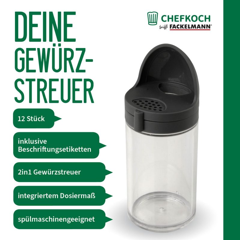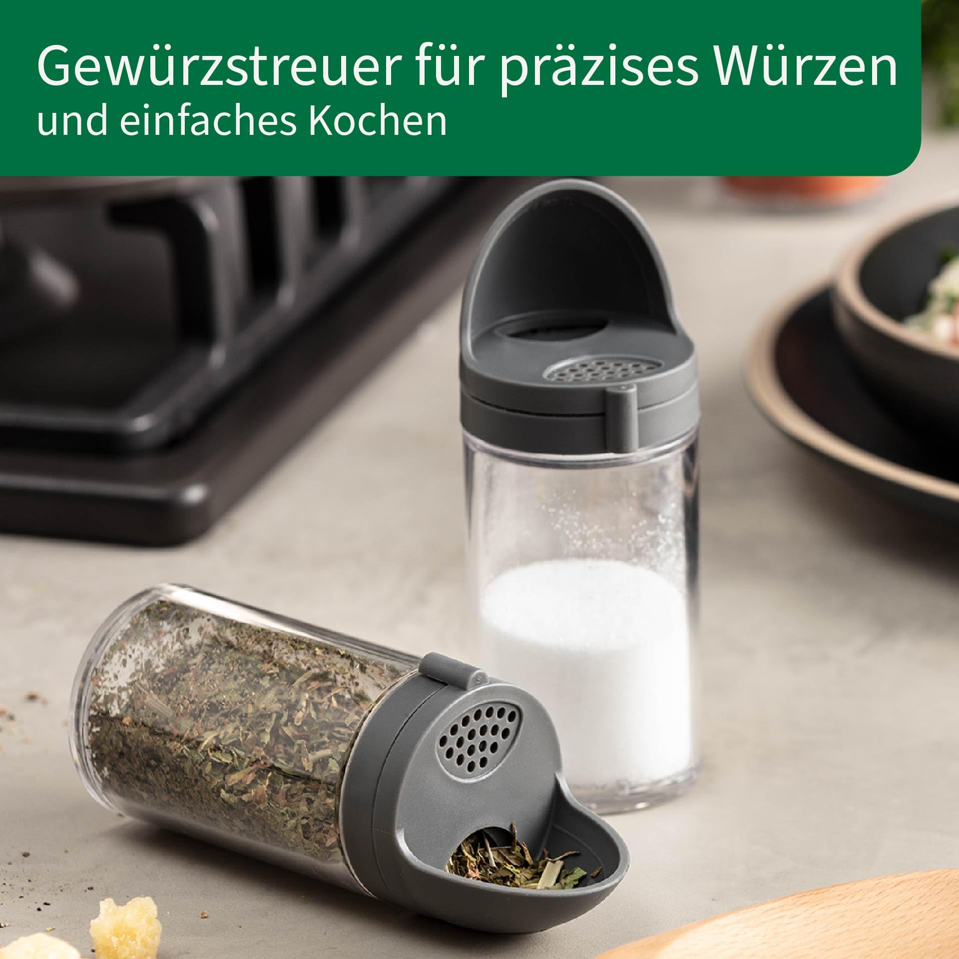 Chefkoch 2-in-1 Spice Shaker with Dosing Size: Easy Measuring & Adding Spices – Set of 12, 100 ml Capacity – Includes 12 Label Labels – Dishwasher Safe – Grey/Transparent FACKELMANN