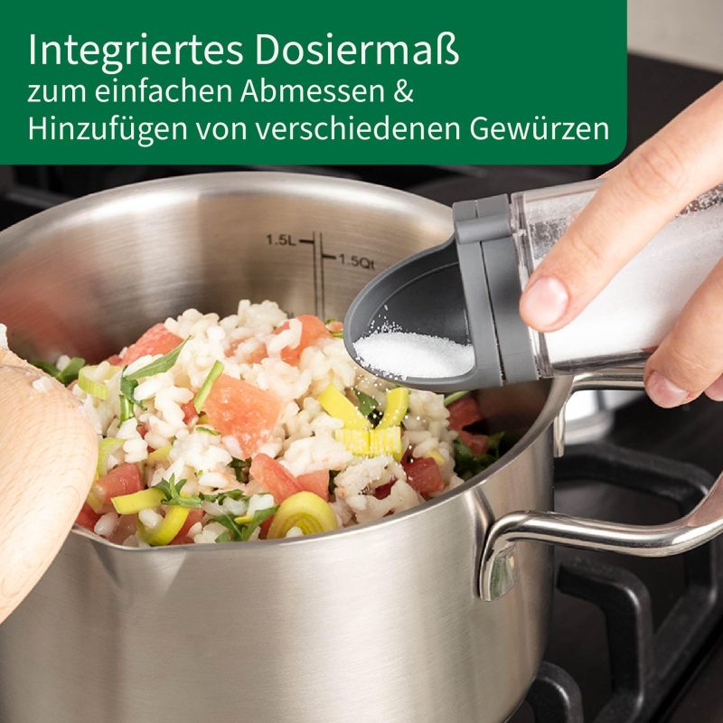 • Integrated dosage size (1 tsp) – Precise measurement and addition of your spices without additional measuring spoons or estimates