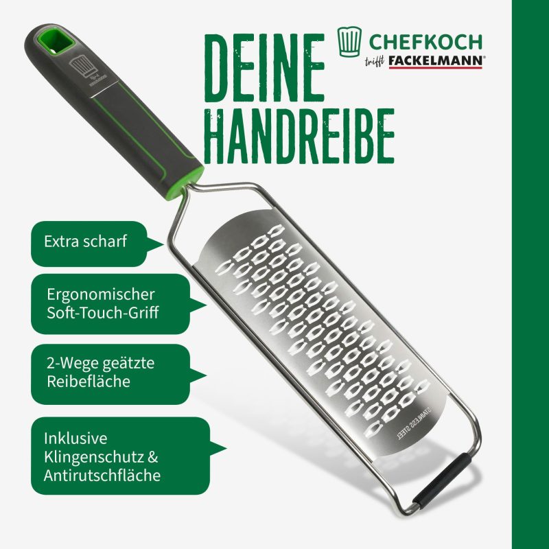CHEFKOCH Premium Hand Grater – 2-Way Etched Grating Surface, Ergonomic with Soft Touch Handle, Extra Sharp, for Cheese, Chocolate & More, Includes Blade Guard FACKELMANN