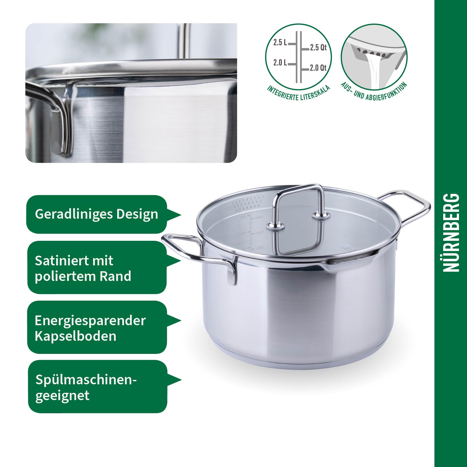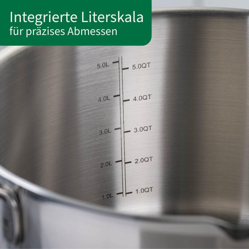 Practical features: flared rim for easy pouring and pouring function in the lid make it easier to transfer liquids, the integrated litre scale ensures precise measurement of your ingredients directly in the pot