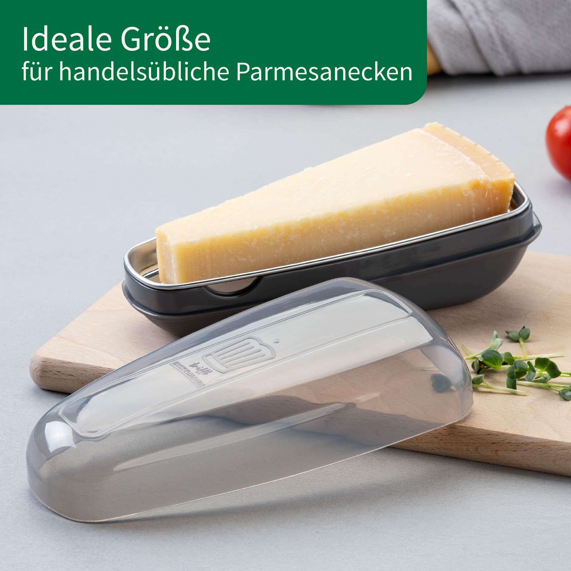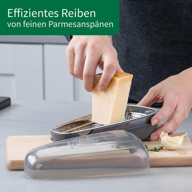 2-in-1 functionality: this Parmesan grater combines two practical functions: efficient grating and safe storage of cheese in a transparent box