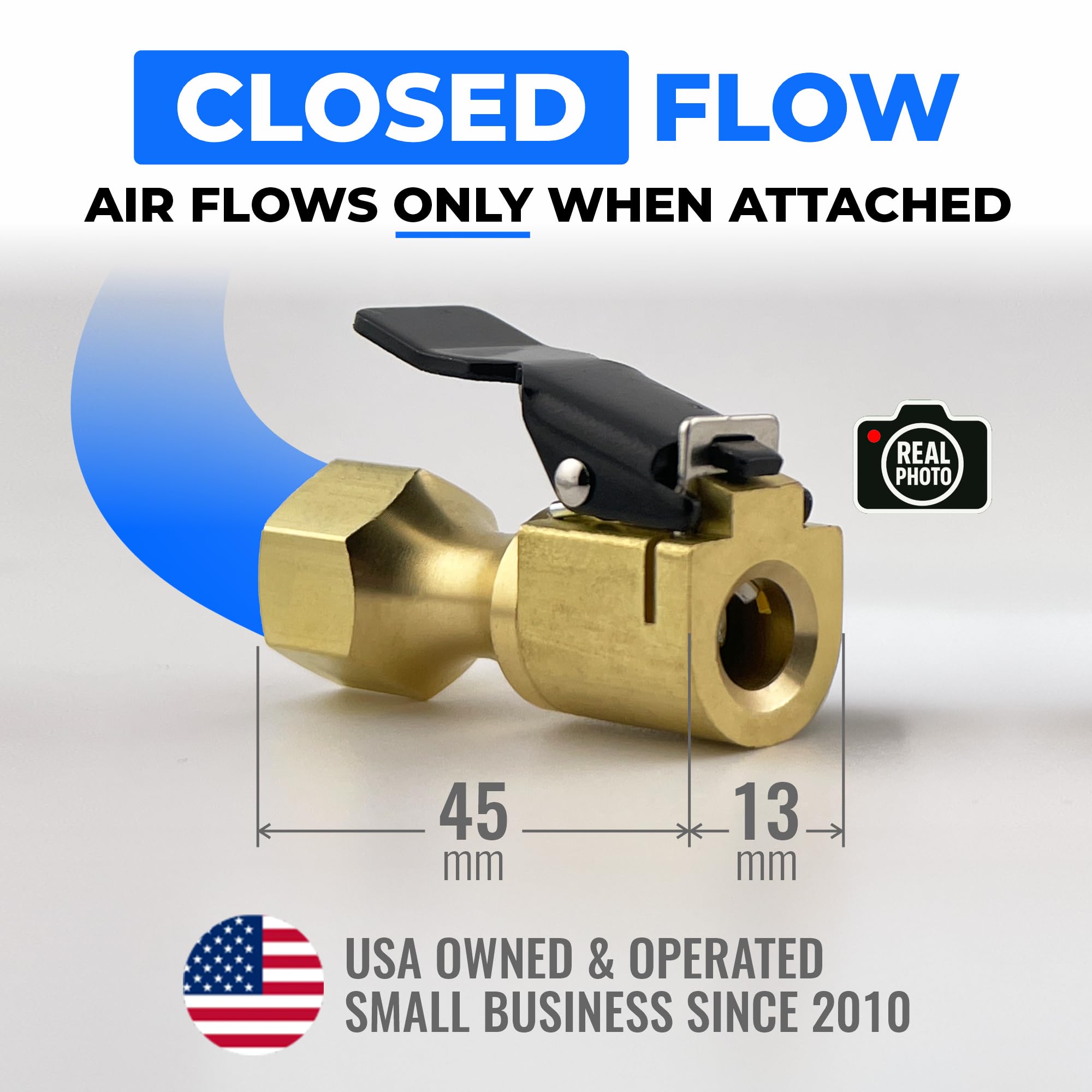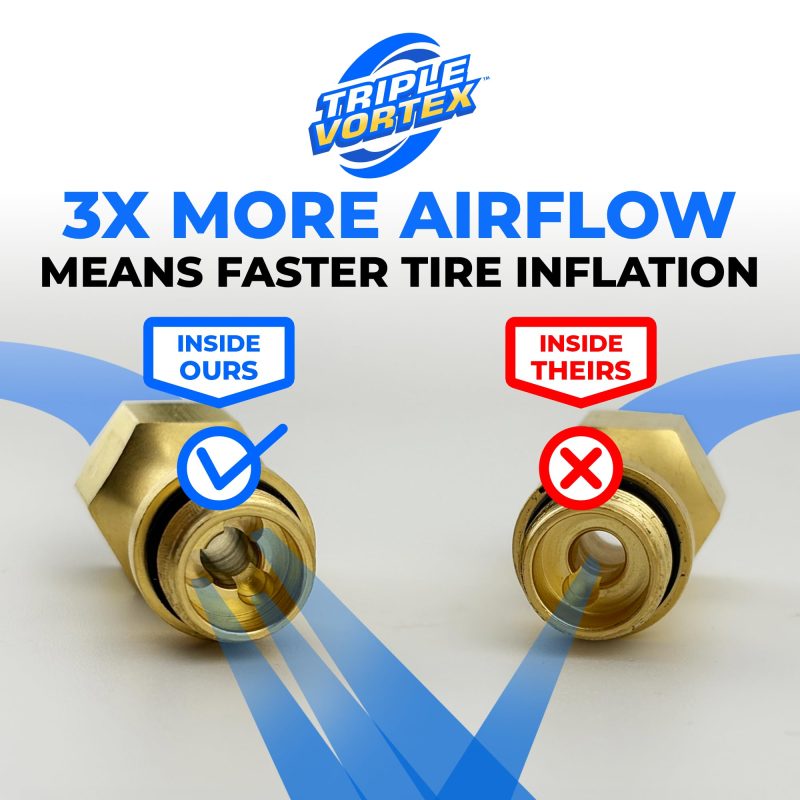 Triple Vortex Airflow: Exclusive design offers 3X more bypass airflow compared to standard inflator chucks, significantly decreasing tire inflation time.