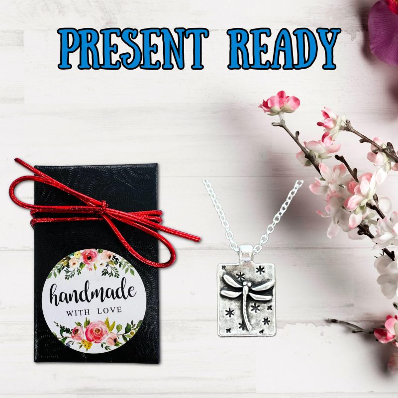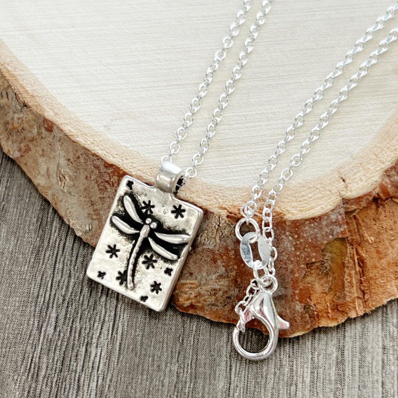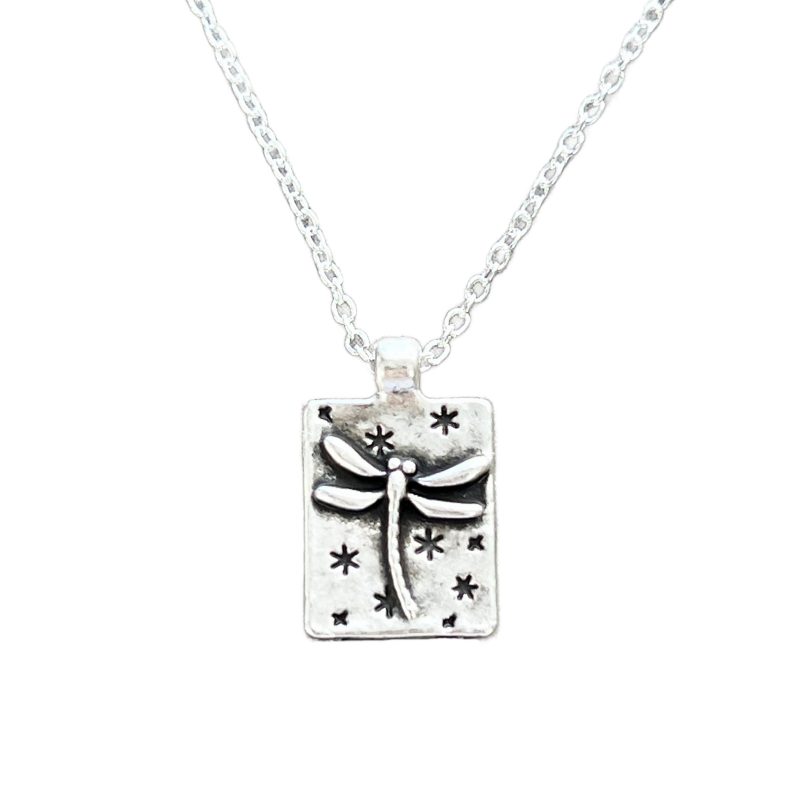 Antique silver tone dragonfly pendant is about 1/2″ x 3/4″ on a silver plated 18″ necklace chain.