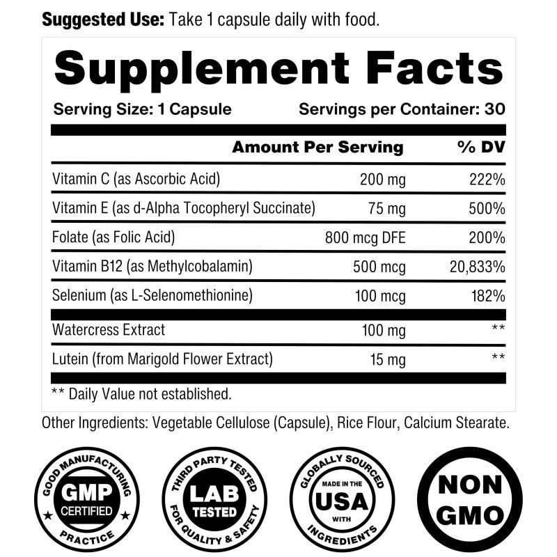 Targets DNA Integrity: Packed with science-backed ingredients like Vitamin C, Vitamin E, Folate, B12, Selenium, Watercress Extract, and Lutein to combat oxidative stress and free radicals.
