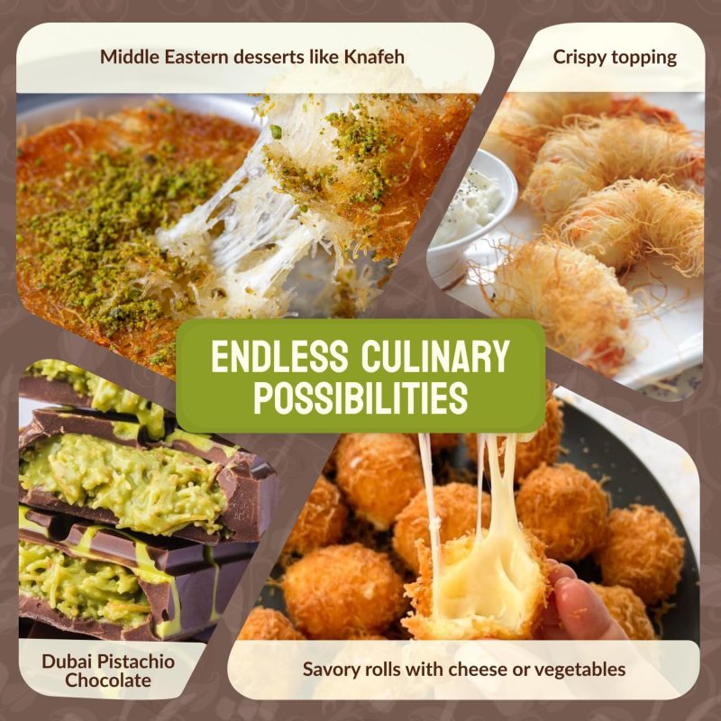 Versatile Usage for Dubai Chocolate and Beyond: Not just for Dubai Chocolate, this shredded dough is incredibly versatile. You can use it to craft shredded fillo dough treats like kataifi pastries, or even experiment with savory dishes such as crispy coated seafood or chicken. The crispy strands hold up well during baking, providing the perfect contrast in both sweet and savory recipes.