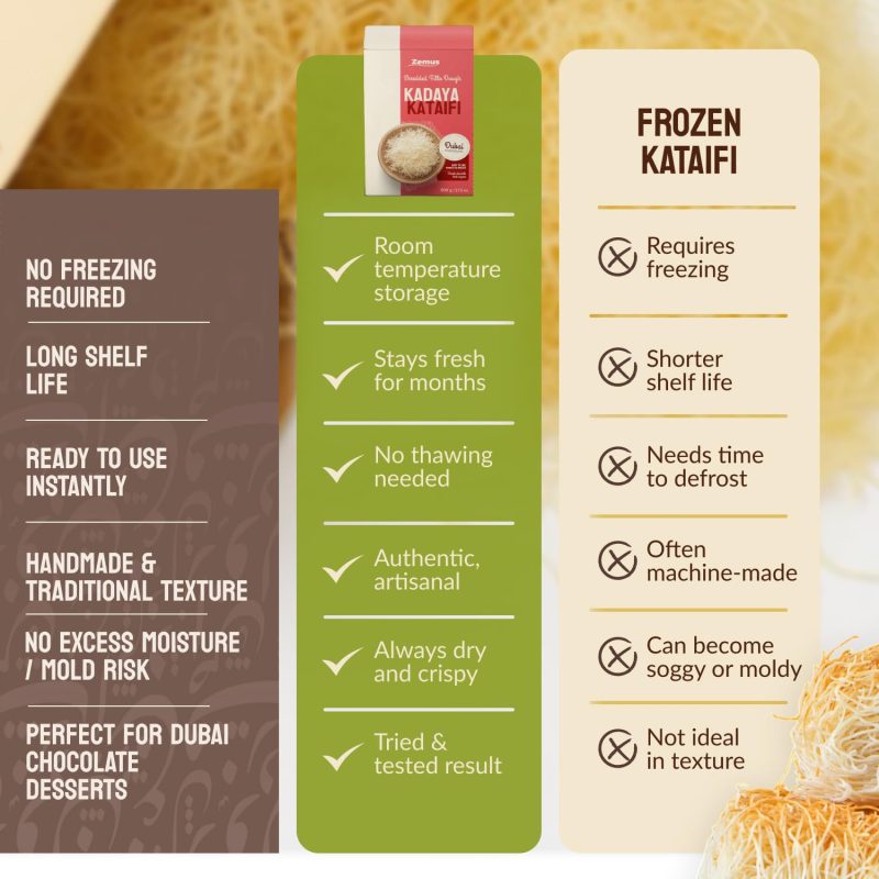 Perfect for Dubai Chocolate Bar Creations: Our shredded kadaifi dough is ideal for crafting the famous Dubai Chocolate bar with pistachio or other fillings. This dough adds the necessary crispy texture that complements the rich, creamy chocolate for an elevated culinary experience. Whether you’re making a classic Dubai Chocolate bar or experimenting with unique flavors, this shredded dough provides the essential crunch to make your creation stand out.