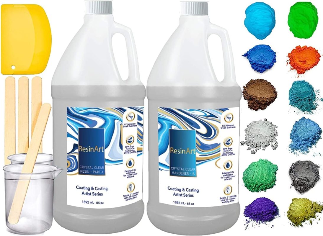 Epoxy Resin AB Part – 1 Gallon Crystal Clear Resin Kit for Art Craft Resin Jewelry Making River Tables Casting and Coating 10 Mica Pigments, 2 Glow in The Dark Colors, 3 Accessories ResinArt Supply