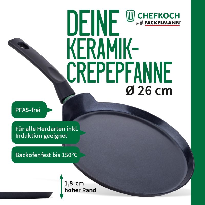 FACKELMANN Chefkoch Bielefeld Crepe Pan Diameter 26 cm with Ceramic Non-Stick Coating – Aluminium Pancake Pan: Extra Light – Suitable for All Hobs Including Induction FACKELMANN