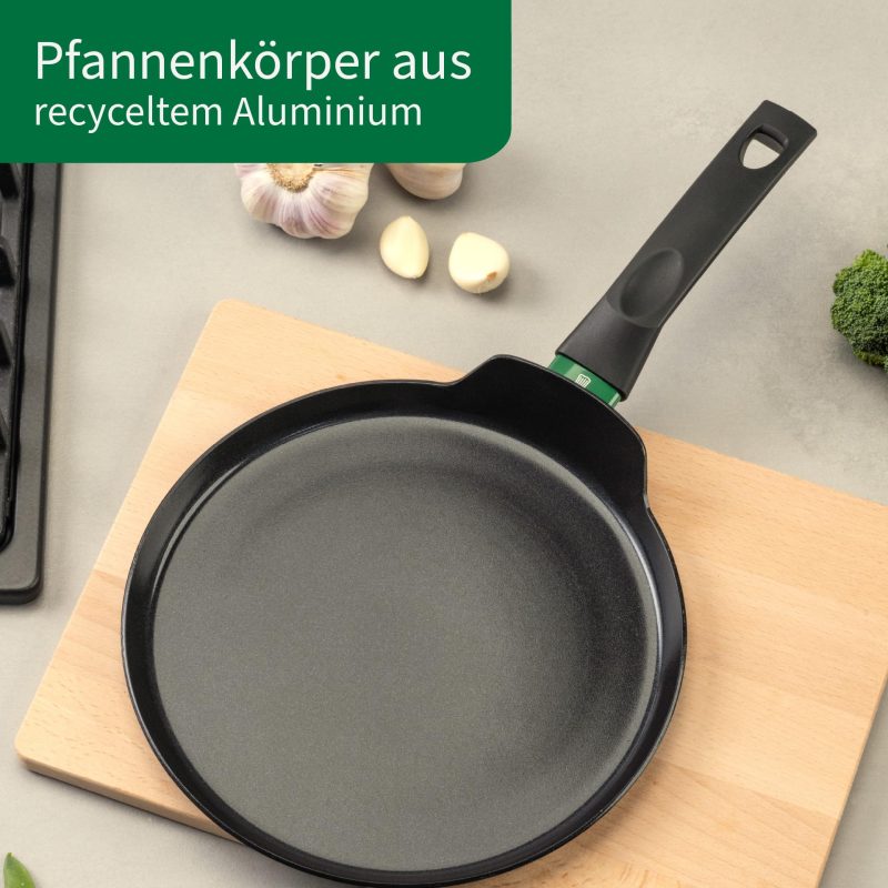Especially light – The flat pan is made from 100% recycled and high-quality aluminium, are therefore particularly light and it is a lot of fun to cook