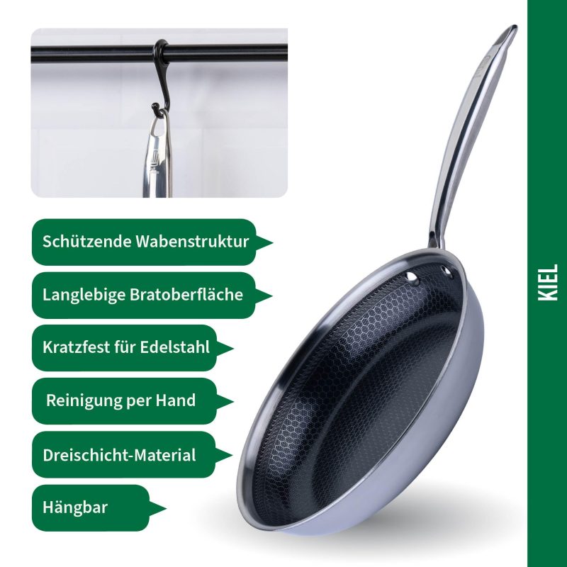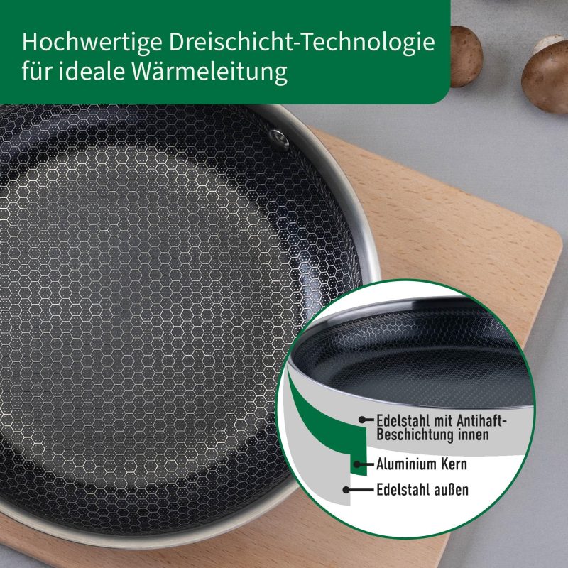High-quality material: the frying pan is made of tri-ply (stainless steel outside, aluminium core, stainless steel inside) and offers optimal heat conduction, energy efficiency and promises a long service life and high stability