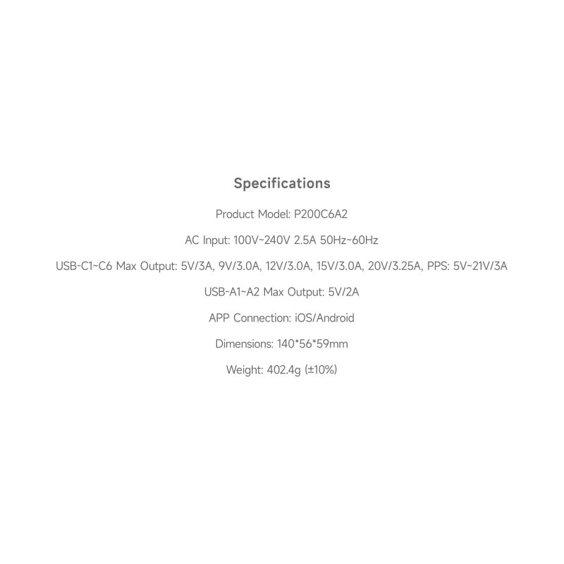 200W Maximum Output with 6×65W USB-C Ports:Power up to eight devices simultaneously with a total output of 200W. Each of the six USB-C ports supports up to 65W, providing fast and efficient charging for all your devices.