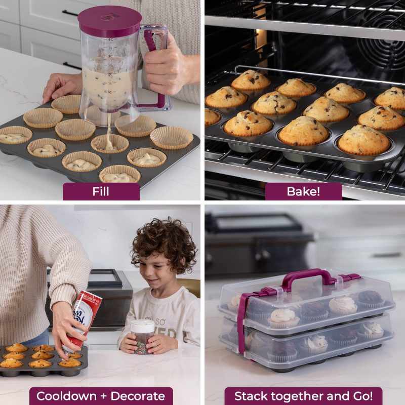 STACK TOGETHER AND GO – Our innovative design lets you fill, bake, cool down, and decorate your cupcakes right in your cupcake pan. That way you don’t have to move your decorated cupcakes around anymore and be in danger of messing them up. Just put the lids on the cupcake pans, either use one cupcake pan or stack them together, put the strap around & connect the strap to the handle. Just click & pull tight and you are ready to go – that’s how easy it is!