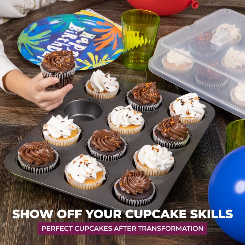 PERFECT CUPCAKES AFTER TRANSPORTATION – Since your cupcakes stay in your cupcake pan with our innovative stacking cupcake carrier design, you don’t have to worry about them moving around or falling over while transporting. That way you can show off your cupcake skills for every party and be at ease that your cupcakes arrive as pretty at the destination as when you decorated them. And our design is expandable up to 3 cupcake pans with a 2nd set so you can transport up to 36 cupcakes.