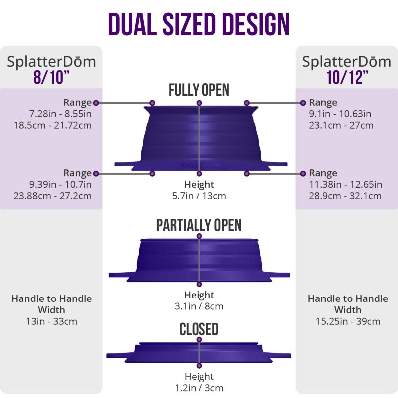 ADJUSTABLE DESIGN: Our splatter dome for frying pan fits most 10 & 12-inch pots and pans & can be used closed, partly open, or fully open. The adjustable height of this splatter dome collapsible for frying pan provide better cooking control