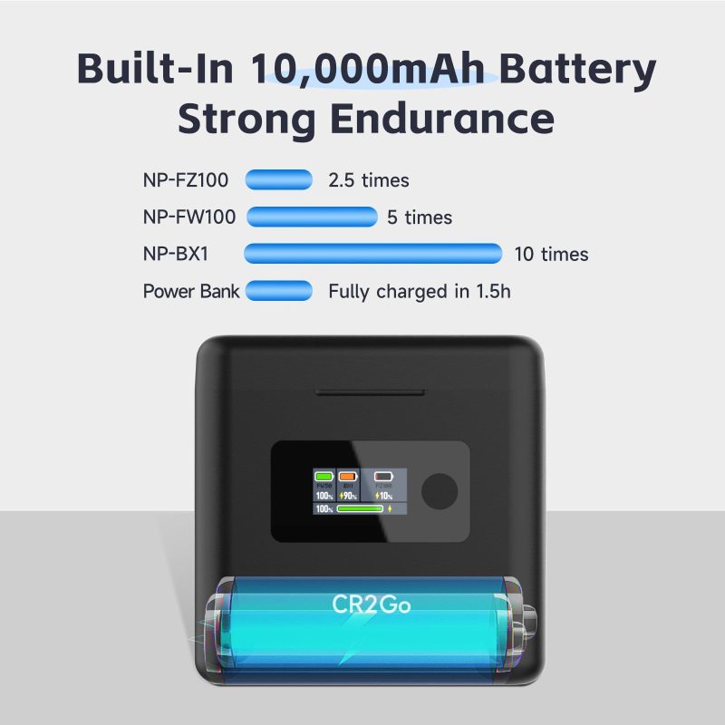 [Ample Power Supply] Strong endurance, fully self-charging in just 1.5 hours. There are various charging modes: NP-FZ100 battery charging mode, hybrid battery charging mode, NP-FW50 battery charging mode, and NP-BX1 battery charging mode; It supports simultaneous charging of up to two NP-FZ100 and two NP-BX1 batteries; It can charge NP-FZ100 batteries up to 2.5 times, NP-FW50 batteries up to 5 times, and NP-BX1 batteries up to 10 times