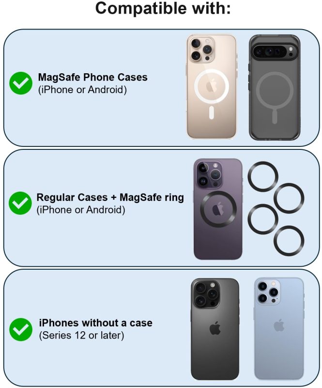 ACCESSORIES INCLUDED: Comes with 2 silicone pads for a snug fit on different handlebar sizes, plus a MagSafe conversion ring for phones or cases without built-in magnets.