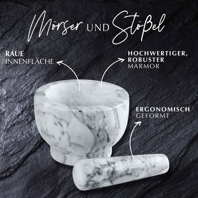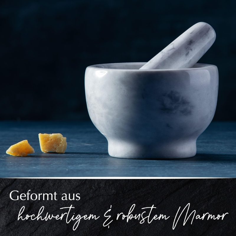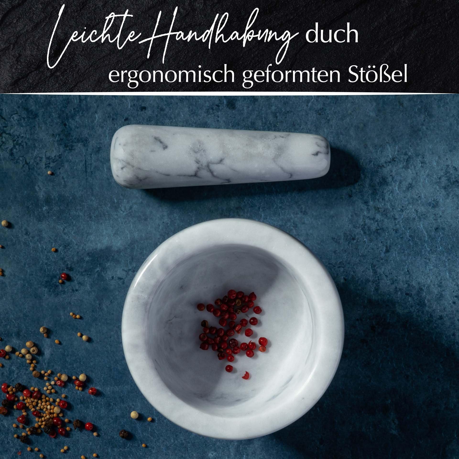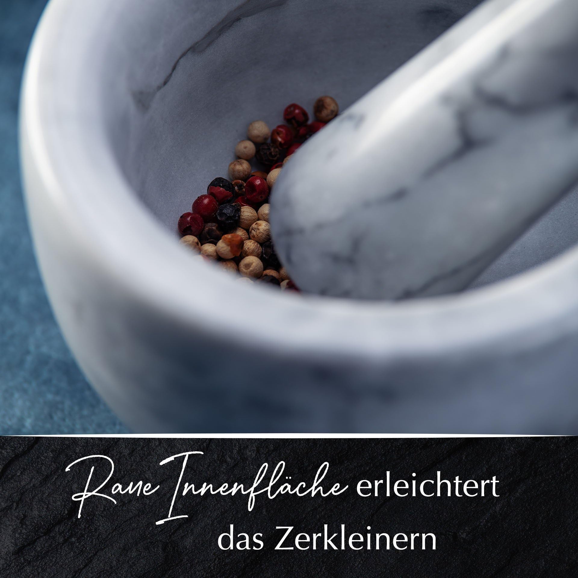Box contents: 1 x mortar with pestle: marble, diameter 12.5 cm, height 9 cm, total weight 1870 g, easy to clean by hand