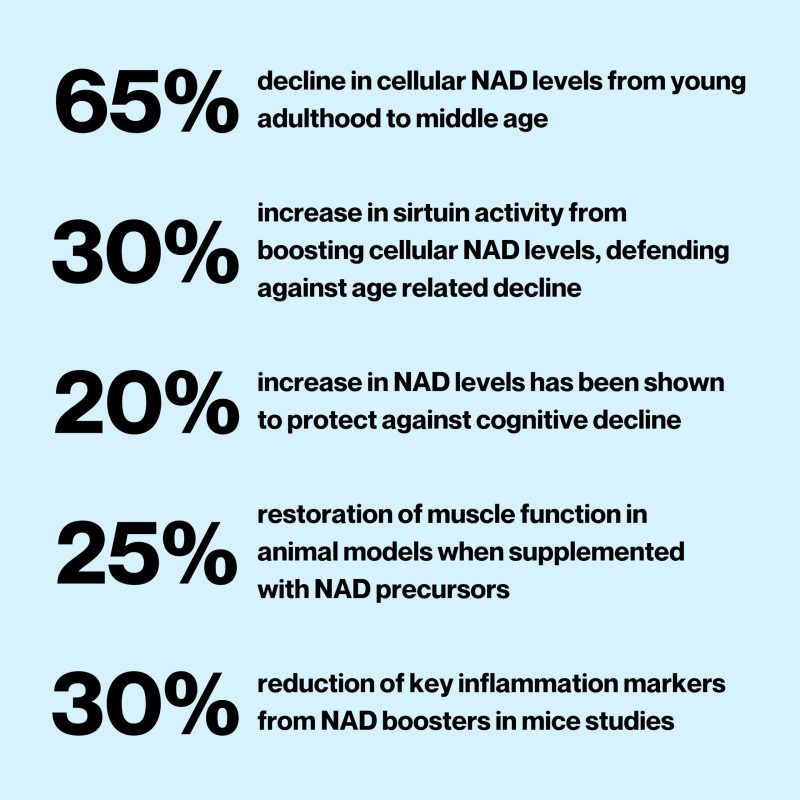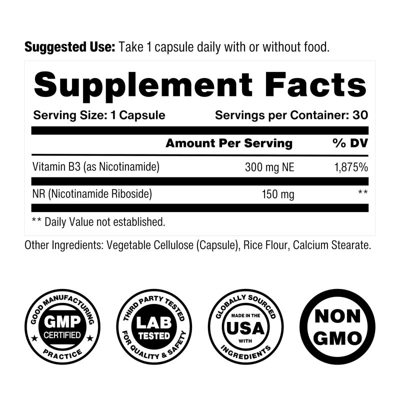Powerful NAD Support: Features Nicotinamide Riboside (NR) and Vitamin B3 (Nicotinamide) to boost NAD production for improved mitochondrial function and cellular metabolism.