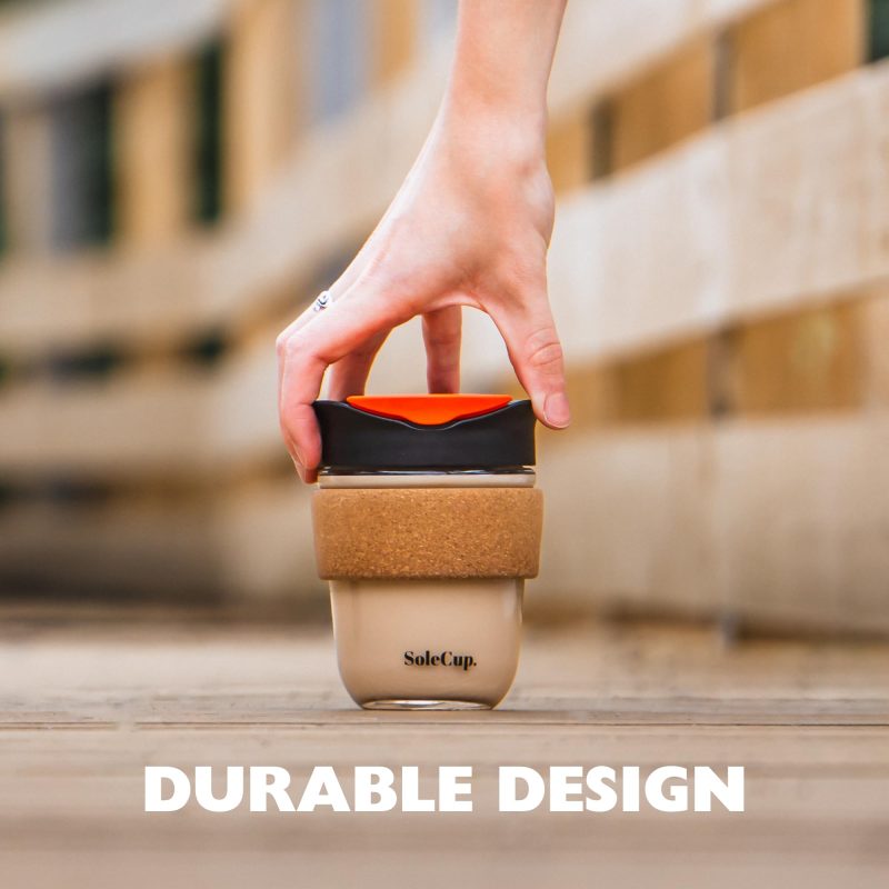 Reusable Strengthened Glass Travel Cup – Spill Proof Insulated Coffee Mug – 12oz/340ml BPA-Free Hot Drink Travel Mug with Lid & Cork Band (Black) SoleCup