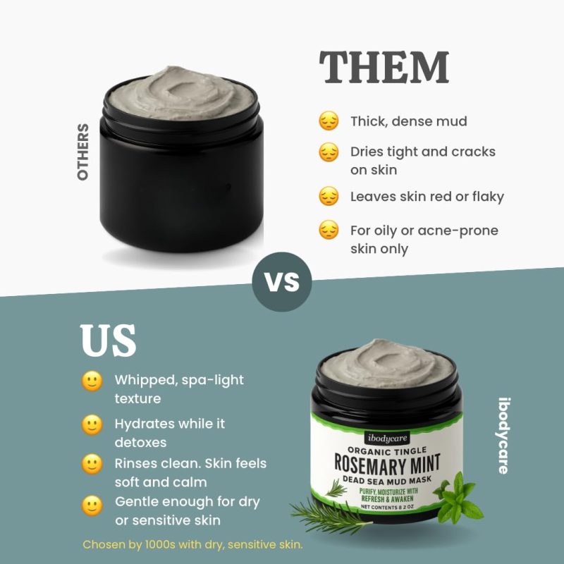 REFRESHING ROSEMARY MINT DEAD SEA MUD MASK: Energizes and detoxifies skin with Dead Sea mud, bentonite clay, kaolin clay, and peppermint to clarify pores and revitalize tired skin.