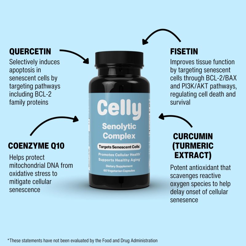 Targets Senescent Cells: Celly Senolytic Complex is formulated to clear out damaged, aging cells, promoting cellular vitality and supporting healthy aging.