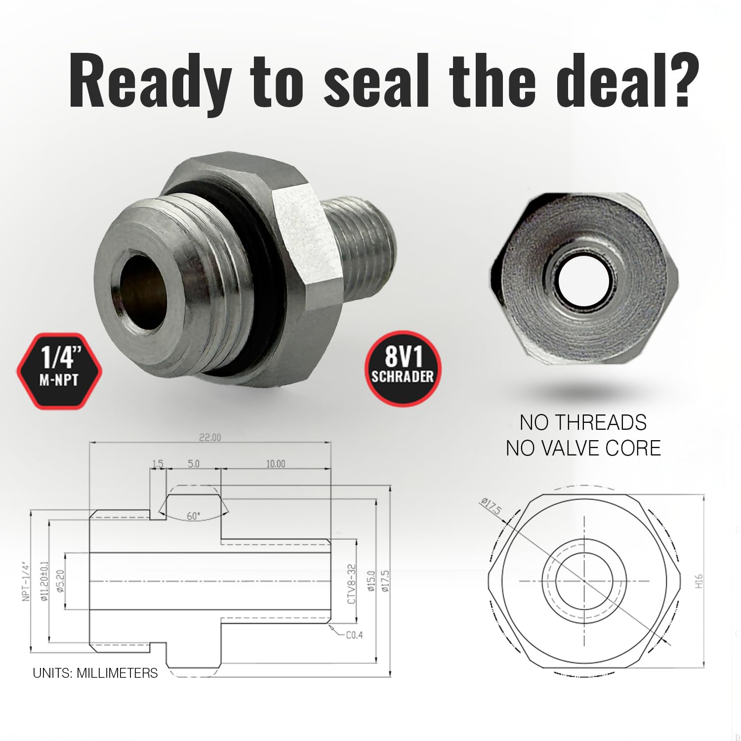 NOTE: NO CORE THREADS BY DESIGN: Adapter does not accept an internal Schrader valve core—purpose-built to connect NPT to Schrader external valves.