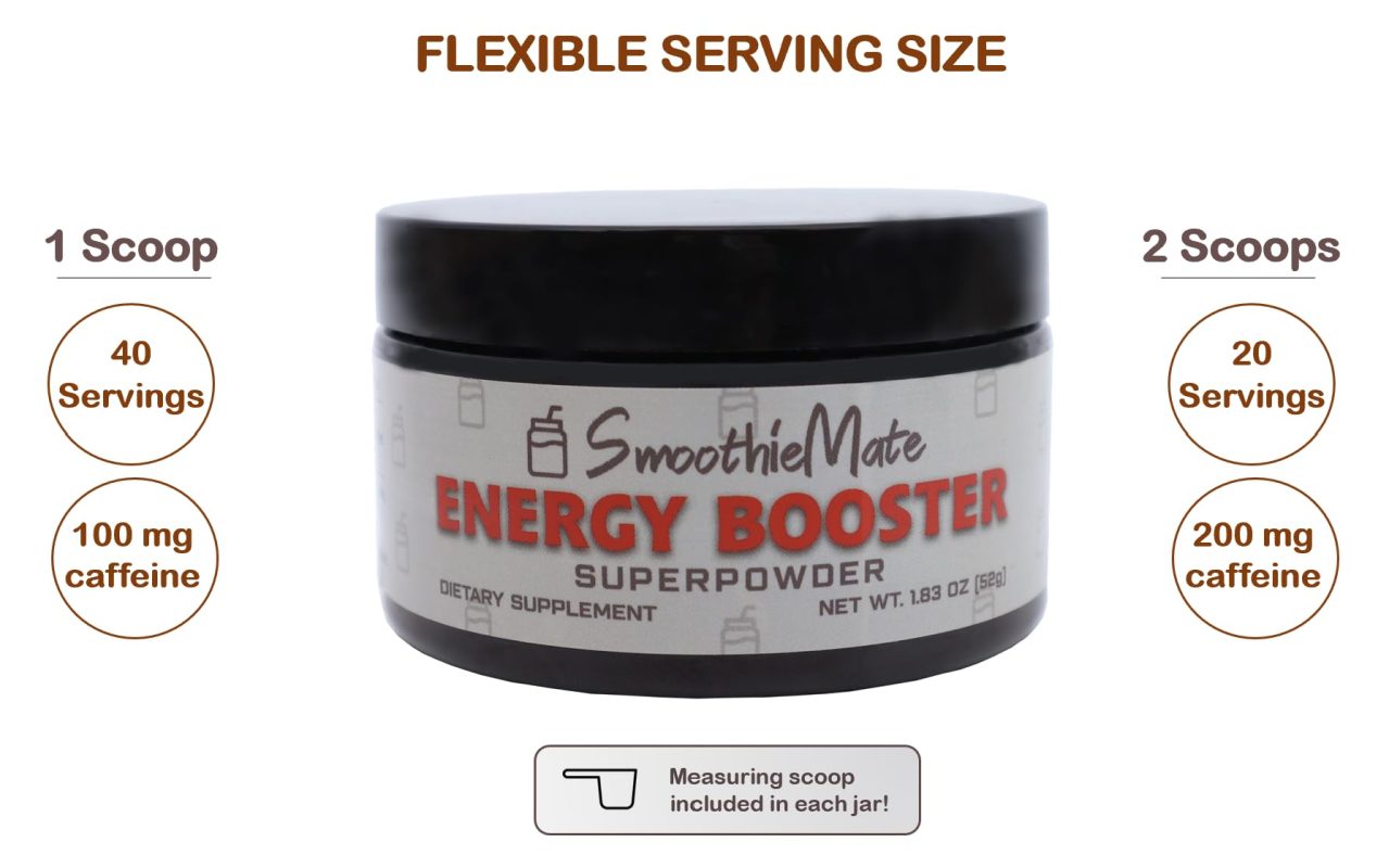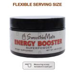 Smoothie Mate Energy Booster Superpowder. Mix into your Favorite Smoothie or Shake for extra focus, alertness, and lasting energy. 100mg of Caffeine per Serving. 40 Servings per Container. Smoothie Mate