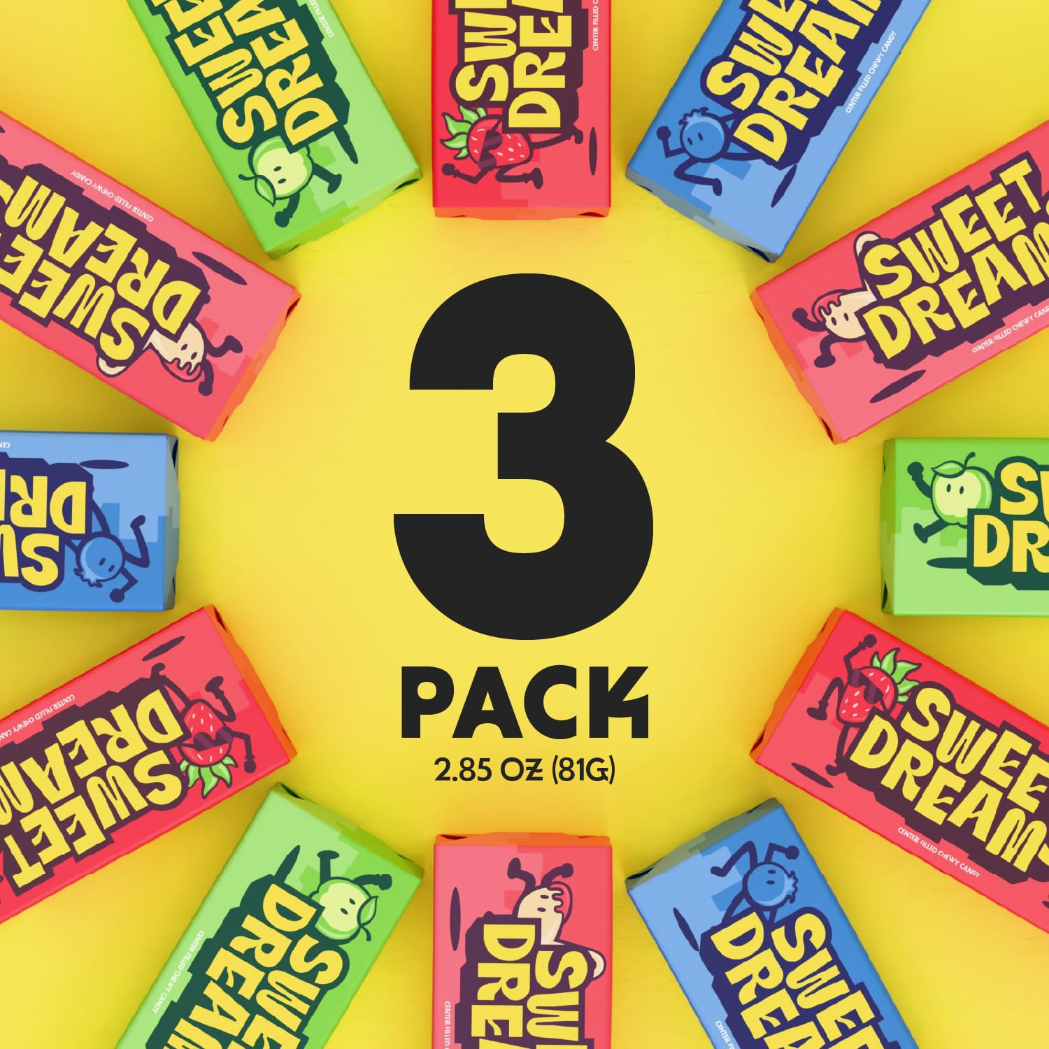 Introducing Sweet Dreams Center-Filled Soft Candy – Each stick overflows with sweet-and-sour kids candy that starts chewy and stays juicy; the perfect fusion for fans of chewy fruit candy and classic taffy chews! Our delicious candy chews are the sweet sensation that unleashes an explosion of real, fruity flavors paired with an enduring chewiness. Join us as we spread sweetness through our candy-filled dreams.