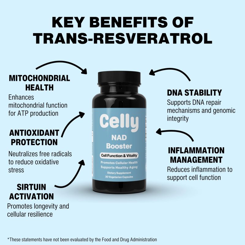 Boosts Cellular Function: Celly Trans-Resveratrol supports DNA integrity and activates sirtuins for metabolic health and vitality.